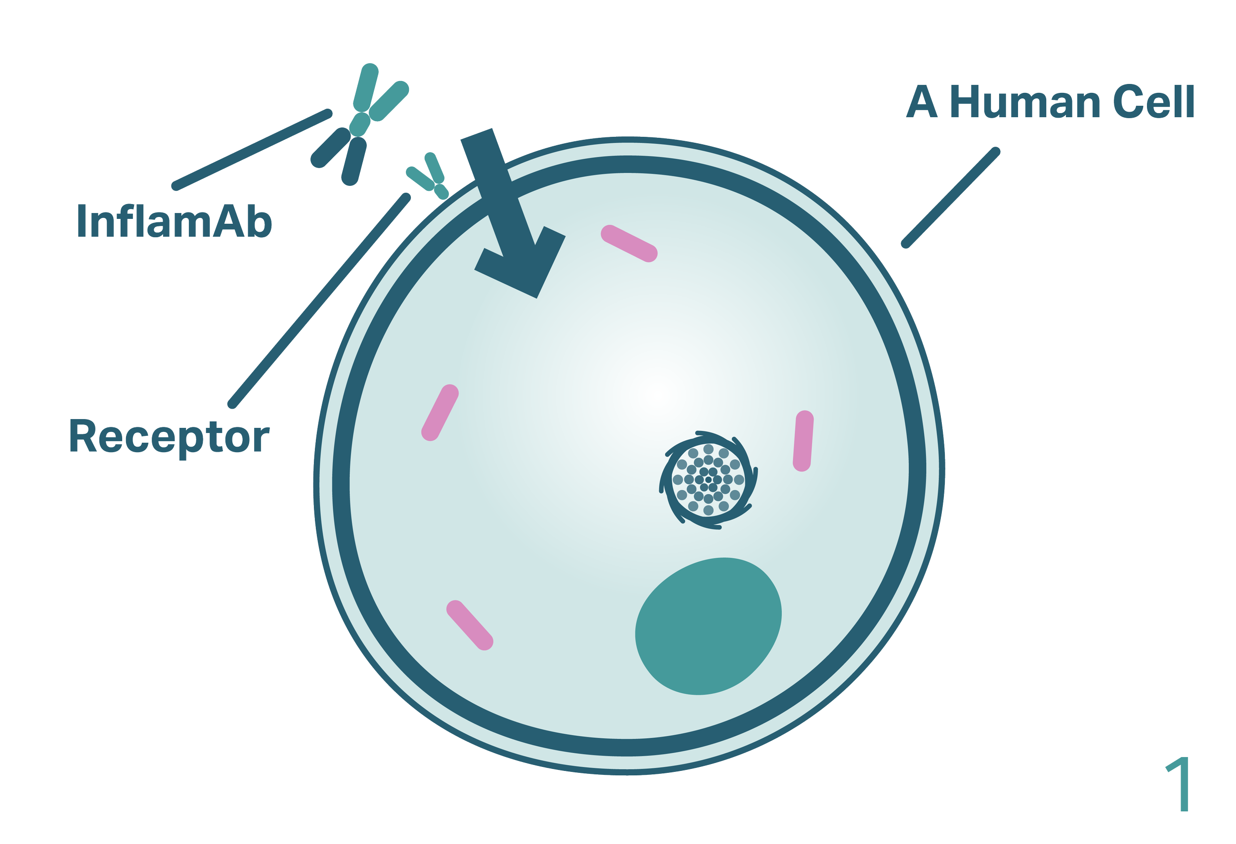 The top half of our antibody IntraCell™ attaches to the receptor and then becomes internalised inside the cell. The bottom half of our antibody InflamAb then binds to a protein (NLRP3) inside the cell