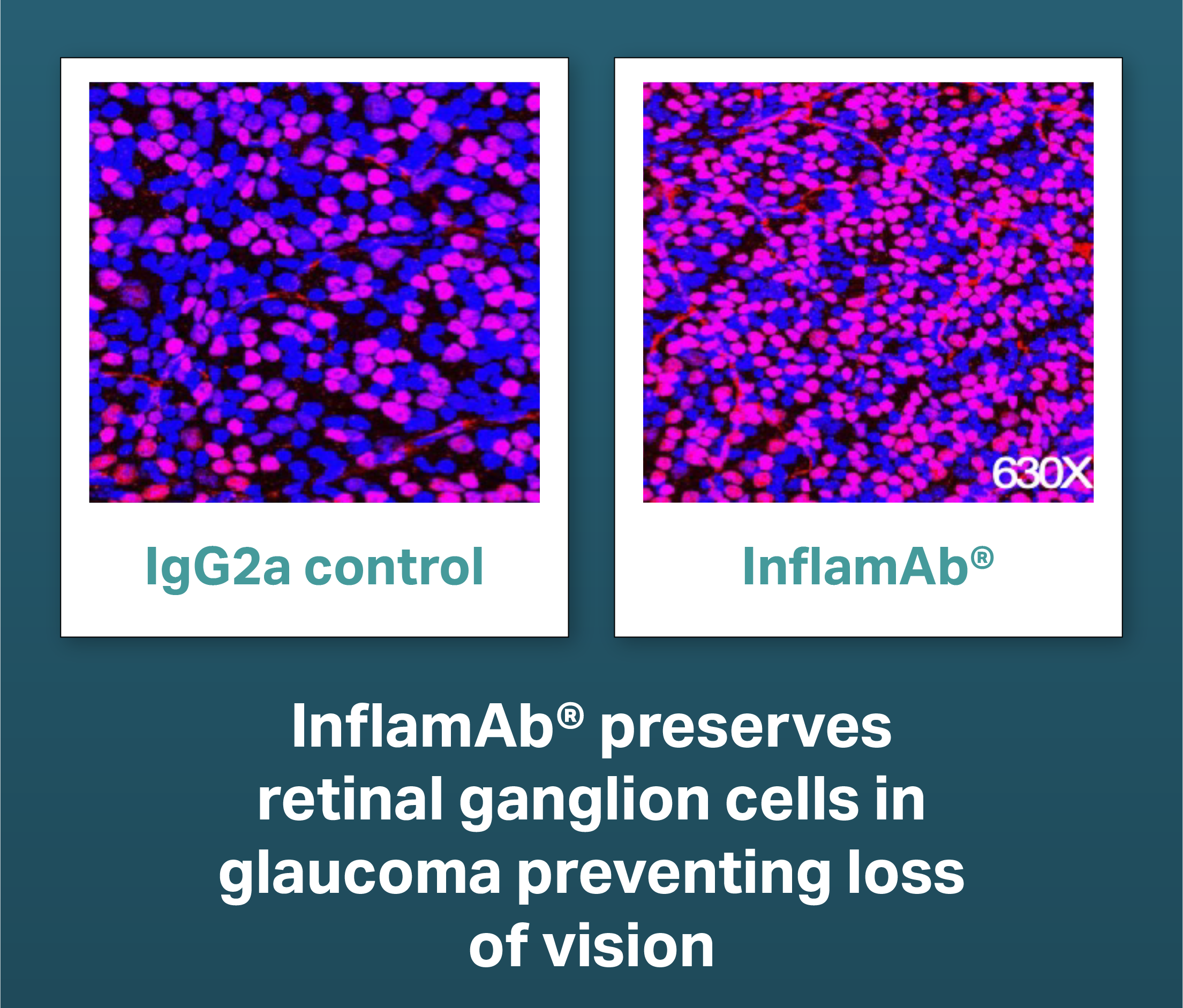 InflamAb is a dual-action antibody designed to tackle both the signals and underlying drivers of inflammation. In preclinical models, it preserves up to 70% of retinal cells in glaucoma, protects 70% of pancreatic beta cells in diabetes, and slows cardiovascular plaque progression by 50%.